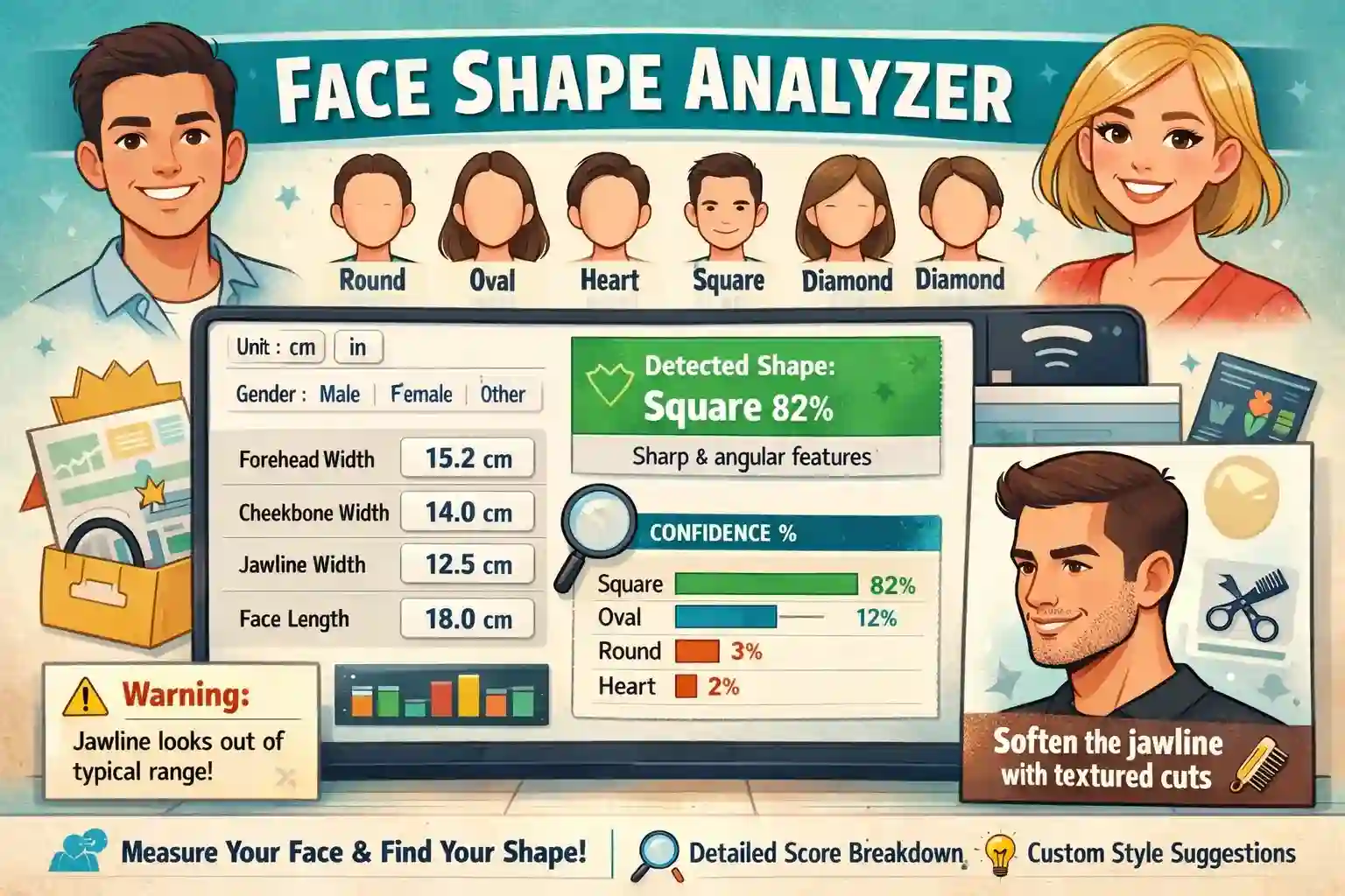 A face shape calculator is a simple way to identify the overall structure of your face using proportions. Instead of guessing by looking in the mirror, it compares key measurements like face length, cheekbone width, forehead width, and jawline width.