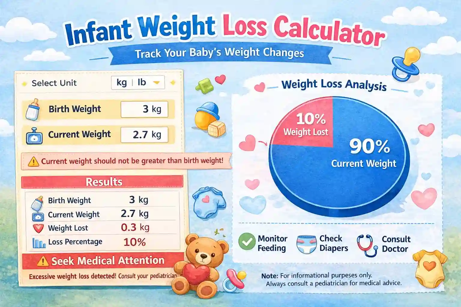 A calculator is not a diagnosis tool, but it can highlight when your baby’s weight change deserves quick attention.
